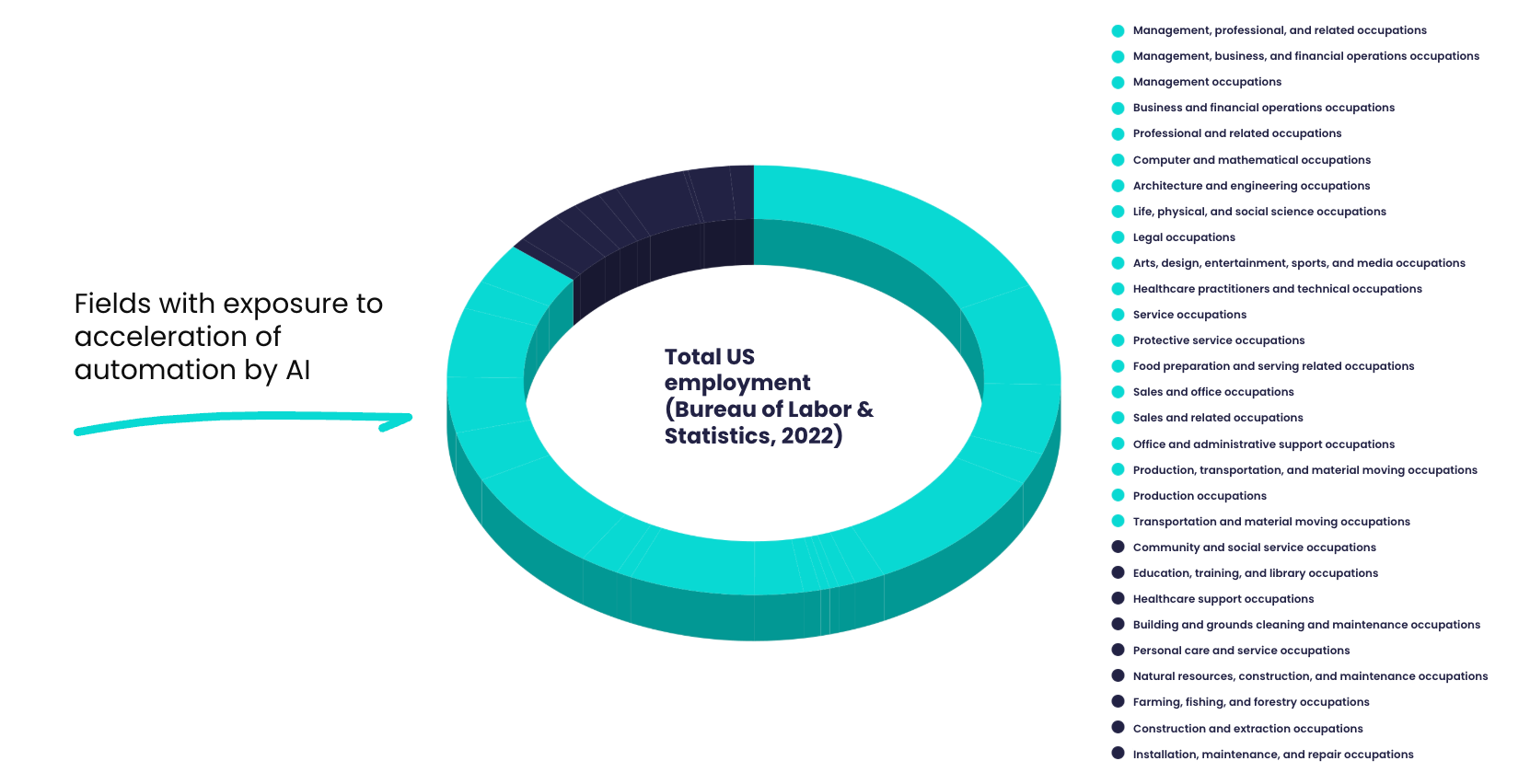 Driving my concern about jobs was mounting research from economists about the massive potential for AI to disrupt the labor market. As early as 2013, an Oxford University study that evaluated the potential for AI (primarily machine-learning at the time) across 702 different job categories in the U.S. concluded that fully 47% could be automated “over the next decade or two.” A working paper from the OECD in 2018 found that 14% of jobs have at least a 70% chance of automation, with a further 32 percent with a probability between 50-70%. At current employment rates, that implicated 210M jobs across the 32 countries in the study.