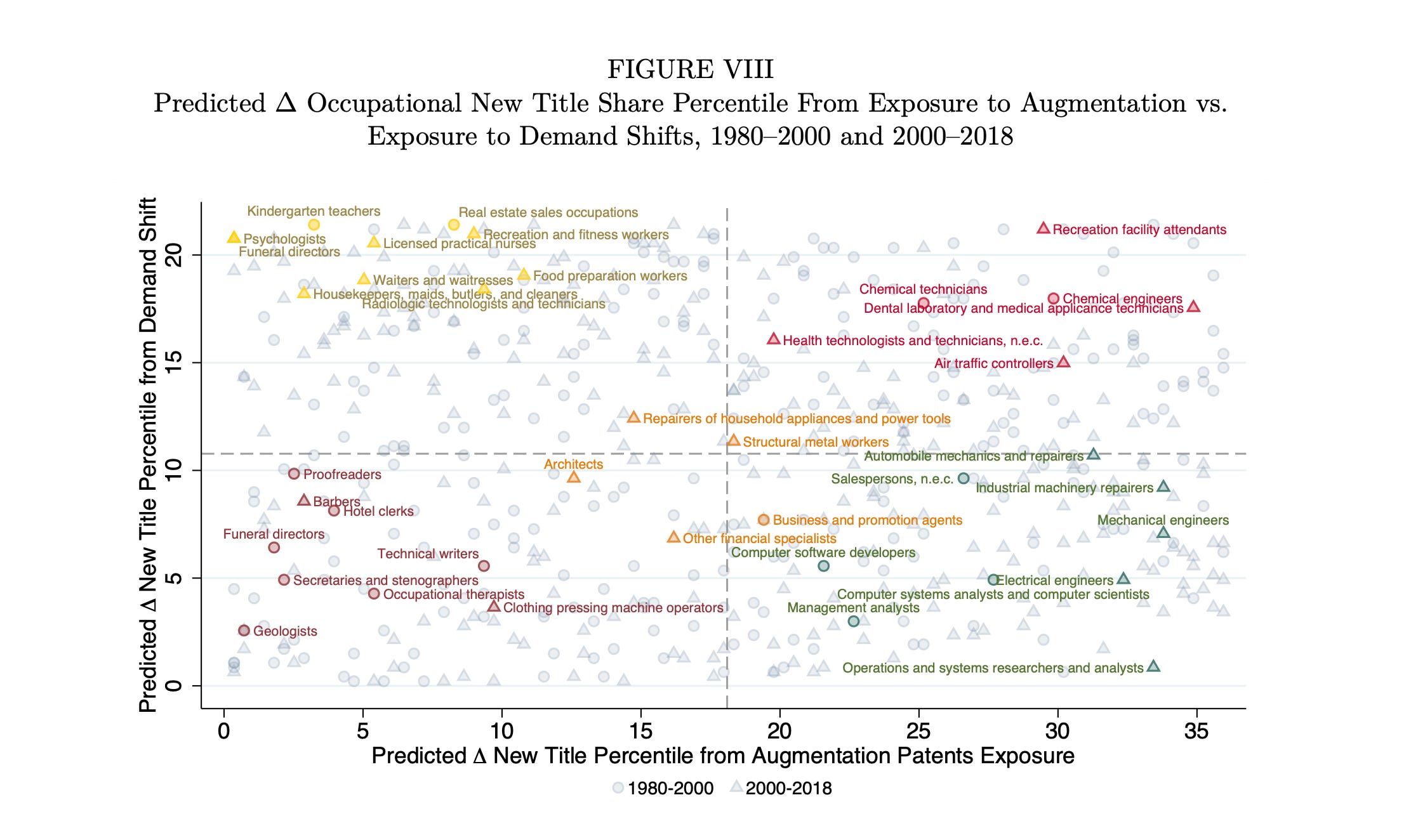 Using a patent-level analysis, Autor et al. distinguish augmentation innovations (which complement what people produce) from automation innovations (which substitute for what people do). Only augmentation patents reliably predict the appearance of new titles; automation patents do not. In practice, that means ultrasound machines created demand for sonographers, while spreadsheet software erased legions of bookkeepers.