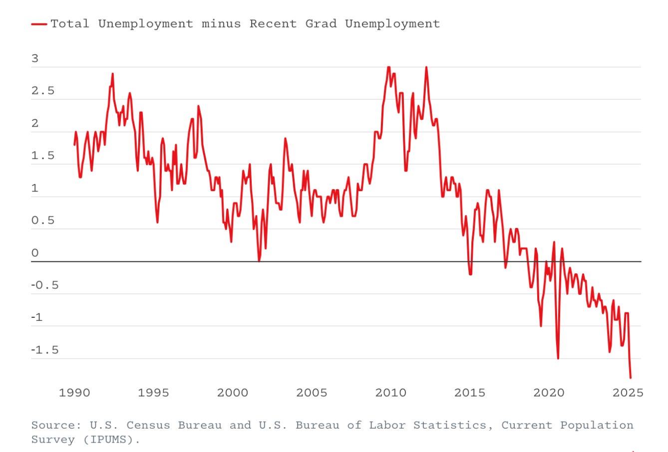 The result is the largest gap between the unemployment rate between young college graduates and the overall labor force.