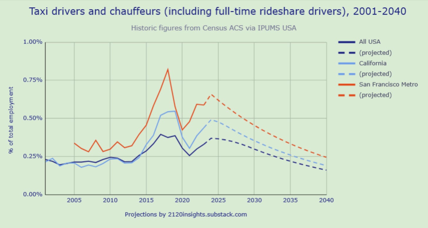 There are a lot of factors in play if one aims to forecast the impact of autonomous vehicles on the ~2M ride-hailing and taxi drivers in the U.S. Regulation, cost, safety, and public perception are all known unknowns. But I think it’s safe to say that driving for Uber and Lyft are unlikely to be sustainable long-term career pathways. Even in the conservative projection above from