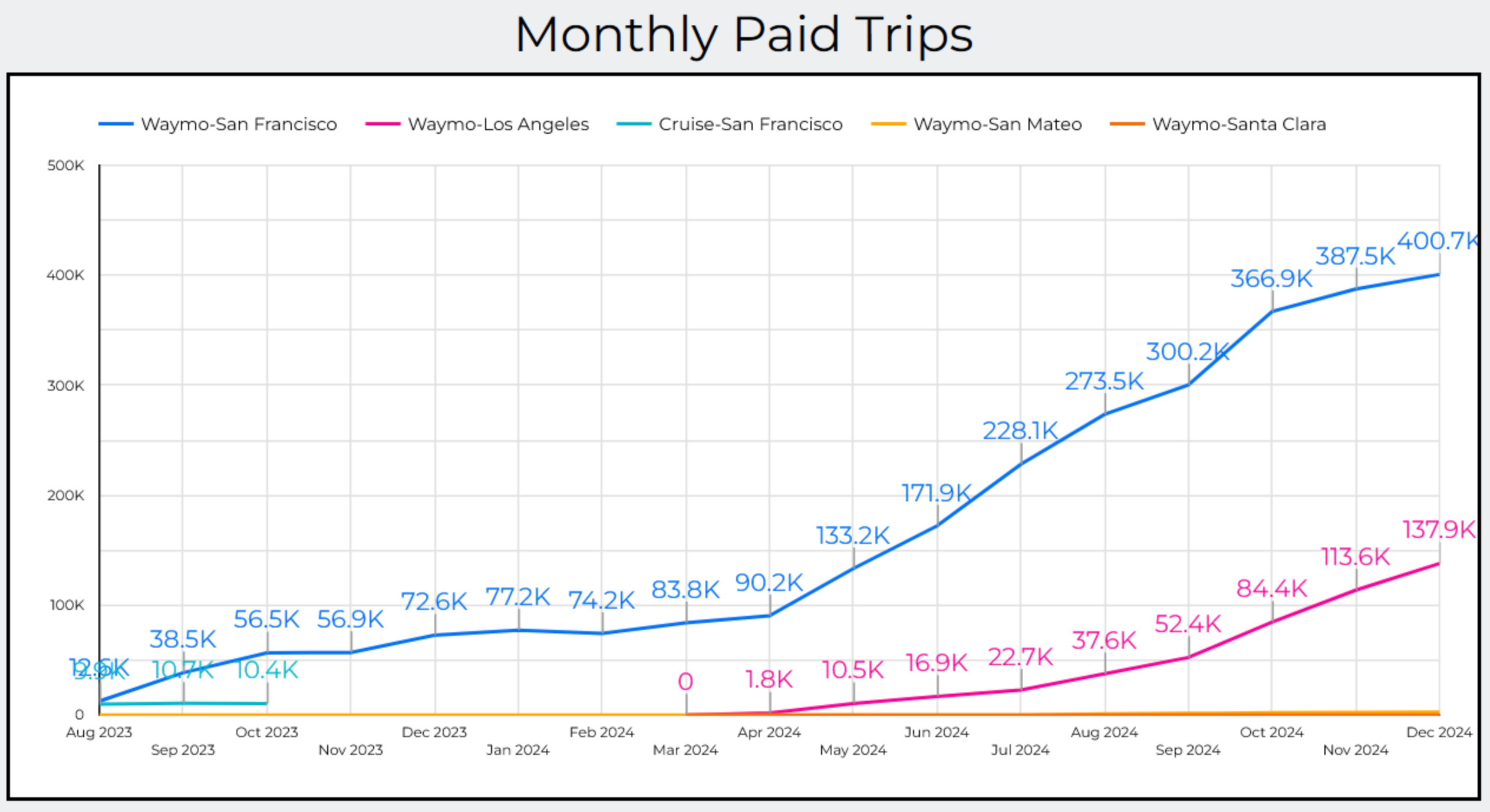 If you live in San Francisco, Los Angeles, Austin, Las Vegas, Phoenix, San Diego, Dallas, Miami, or Atlanta, its likely that you’ve seen Waymo’s iconic self-driving Jaguar I-PACE vehicles. As a local San Franciscan, I can attest to Waymo becoming the dominant mode of transportation for my “techie” friends. Estimates of Waymo’s market share are hard to pin down, but the company passed 537,000 rides per month in December 2024 in SF and LA alone, with monthly growth between 16K-66K rides, which translates to between 3-18% of market share per year.