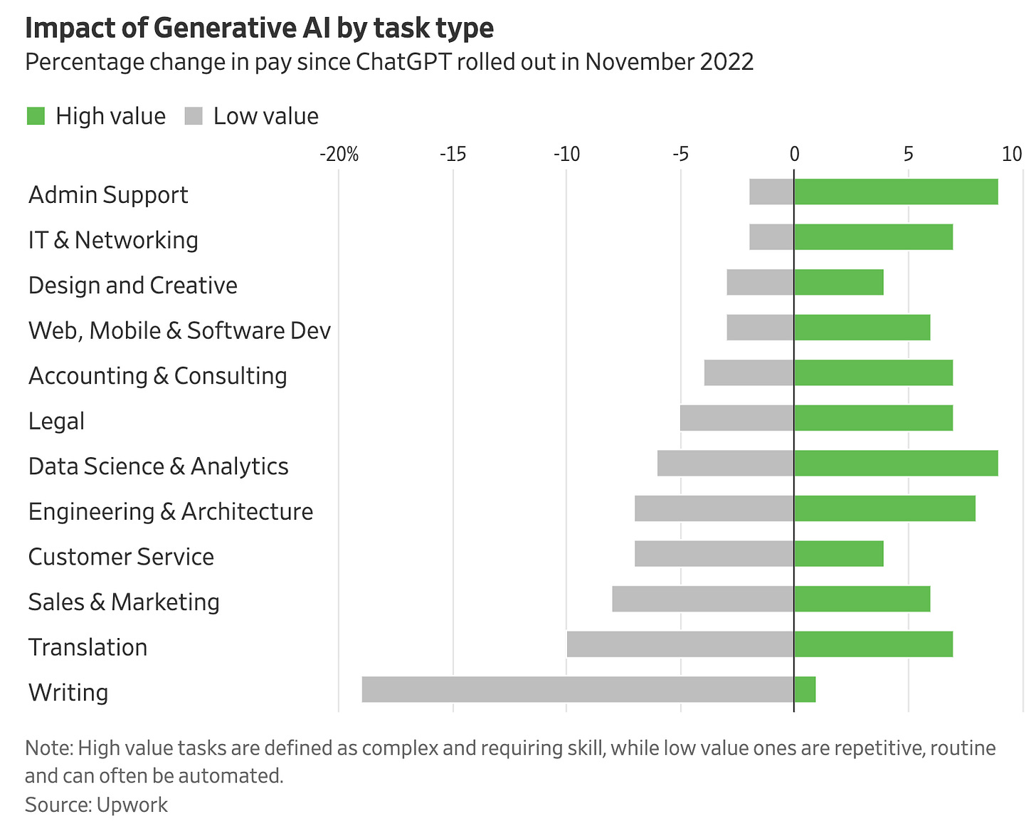 Digital transformation and change management takes time and political capital. Even if AI is today capable of overhauling the way companies do business, there are significant barriers to wide scale implementation at large organizations (i.e. bureaucracy and a low supply of AI knowledge). The freelance job market is far more elastic, on the other hand.